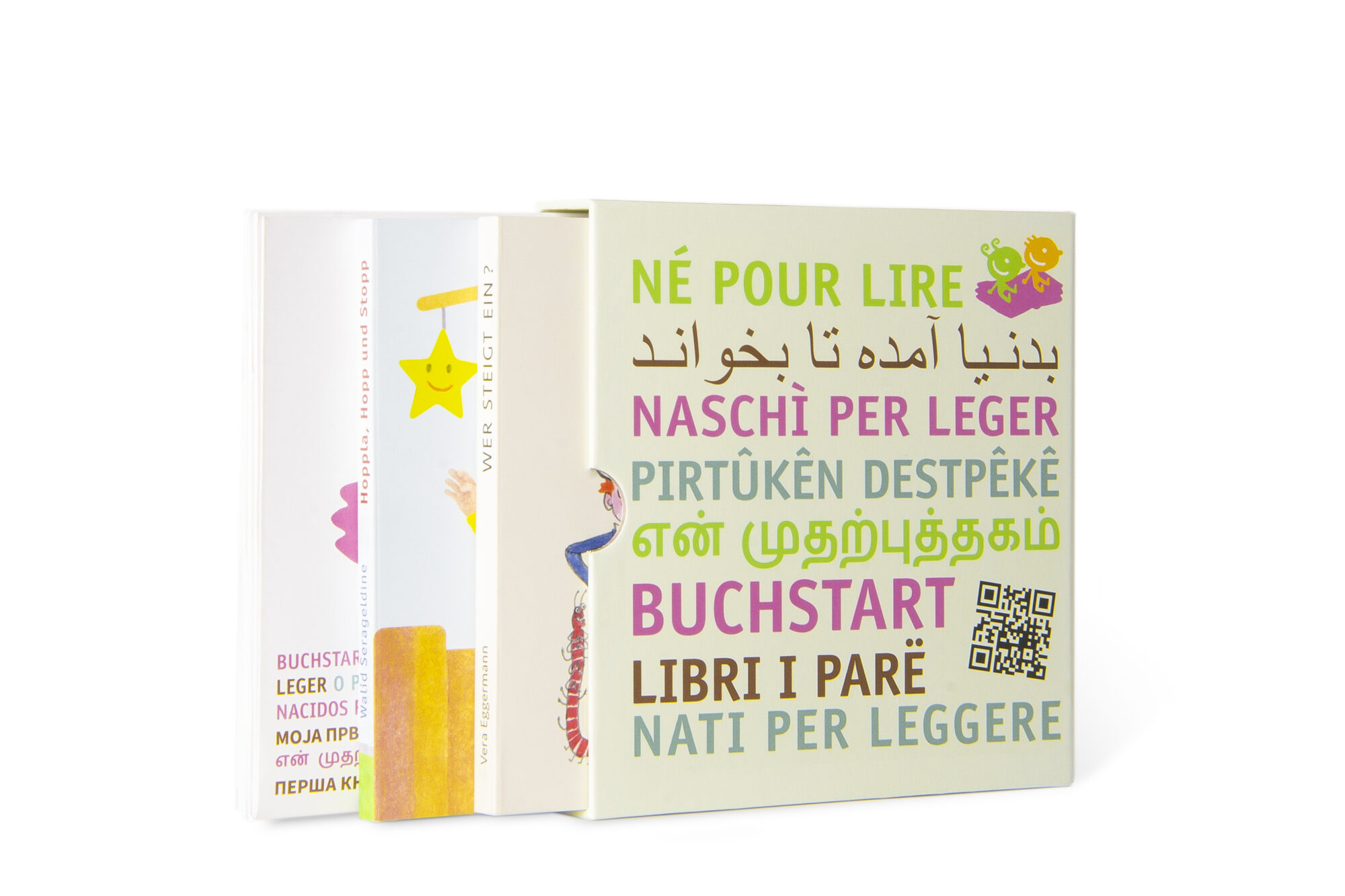 Jedes Neugeborene in der Schweiz erhält über Bibliotheken, Kinderarztpraxen oder Mütter- und Väterberatungen ein Buchstart-Paket mit zwei Pappbilderbüchern geschenkt. Das Paket enthält auch eine mehrsprachige Broschüre, die Eltern zeigt, wie sie eine gesunde Sprachentwicklung bei ihrem Kind unterstützen können.