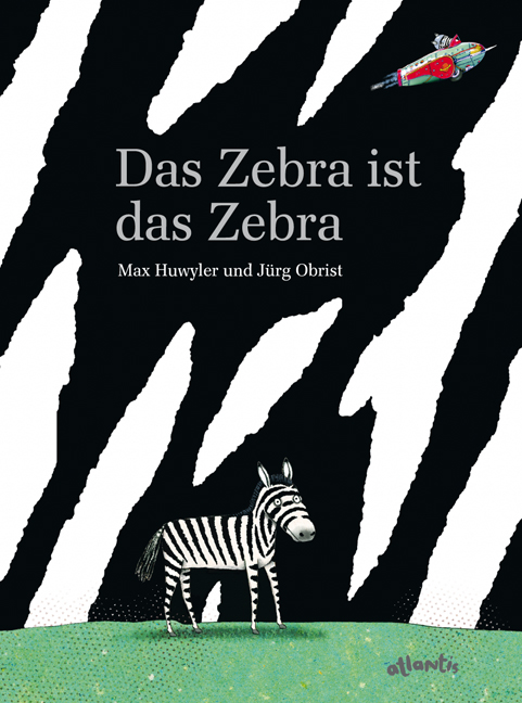 Jürg Obrists bunte Collagen erden Max Huwylers philosophische Geschichte. Sie zeigen eine urbane Zebragesellschaft. Man fährt Auto, geht ins Kino und mag, angesichts der globalisierten Welt, nicht darüber nachdenken, wer man ist. Obrist stellt das kleine Zebra zum Nachdenken in den Stadtwald, dort fällt sein Streifenkleid hinter dicht stehenden Bäumen nicht auf, oder setzt es – Ausdruck seiner totalen Entfremdung – in ein kleines, windschiefes Häuschen mit blau-weiss karriertem Boden und orange gepunkteten Wänden. Als Zebra-Schimmel zieht es wie ein kleines Gespenst mit seinem Fahrrad nächtliche Runden; am Tag nimmt die geschäftige Zebragesellschaft keine Notiz von ihm. Sie ist aber auch nicht nachtragend, als es wieder zurückkehrt. “Da bist du ja wieder”, wird es begrüsst: Ein Zebra unter vielen, aber mit eigenem Strichcode.