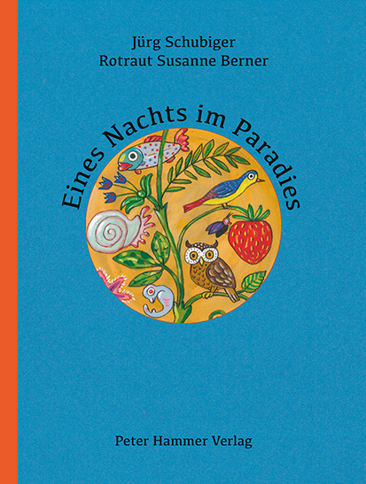 In Rotraut Susanne Berners Bildern – die auf jeder Seite denselben Ausschnitt und dieselbe Perspektive festhalten, bis auf das letzte Blatt, und zunehmend bunter und üppiger werden – gedeiht parallel zum Disput zwischen Adam und Eva die Welt zu Lande, zu Wasser und in der Luft. Von prähistorischen Pflanzenwelten zum verführerischen Granatapfelbaum, von den Einzellern über die Flugsaurier bis zu unseren Haustieren, vom Leermond zum Vollmond, von der naiven nackten Zweisamkeit von Adam und Eva zu ihrer Liebe. Auf dem letzten Bild steckt sich das Paar im Vollmond auf dem Baum der Erkenntnis sitzend gegenseitig Granatapfelkerne in den Mund, um sie herum viele andere Tiere, die ebenfalls genüsslich an den Früchten knabbern. Keine Bedrohung geht von dieser Szene aus und kein Verlust. Im Gegenteil, hier beginnt etwas. Ein grandioses Bilderbuch für jedes Lesealter, das zum gemeinsamen Betrachten und Philosophieren einlädt.
