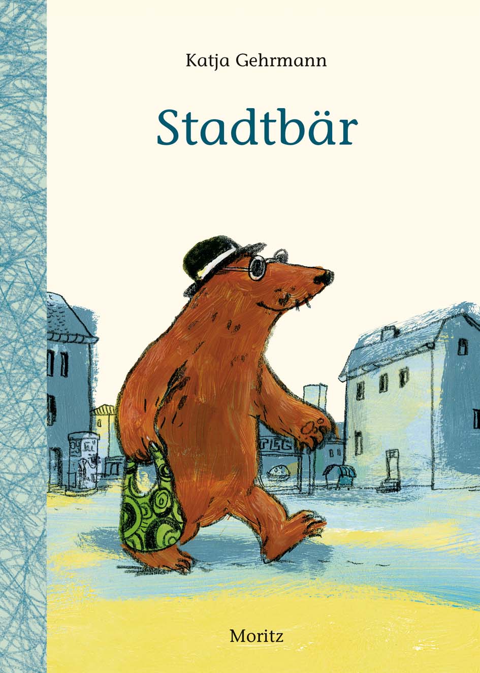 In leuchtenden Blau- und Grüntönen, strahlendem Orange und Gelb erzählt Katja Gehrmann von einem höflichen Bä­ren, der durch die Stadt streift. Dabei kommt es zu den skurrilsten Situationen. Etwa, wenn die BesucherInnen eines Imbisses sich hinter der Schaufensterschei­be drängeln, um mit ihren Handys Fotos von Dachs und Marder zu machen, während der Bär in aller Ruhe das Kuchen-Buffet plündert.